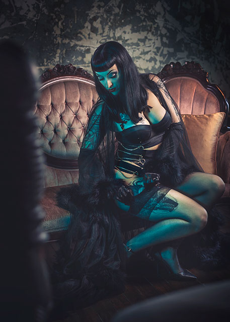 Lady Vi in black lingerie sits elegantly on a couch adjusting her stockings in a gothic vintage atmosphere