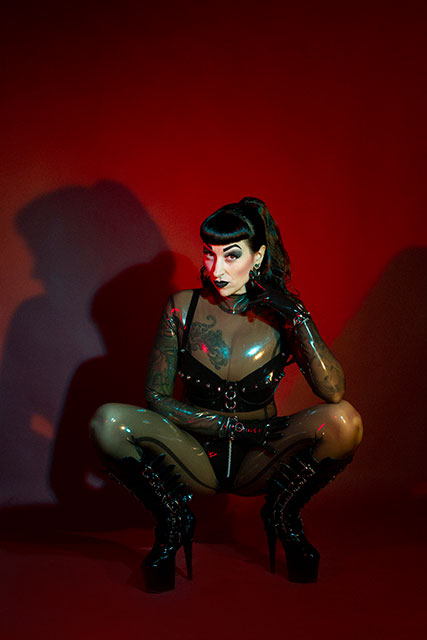 Satanatrix a woman in latex and boots strikes a bold pose while crouching for a captivating photograph