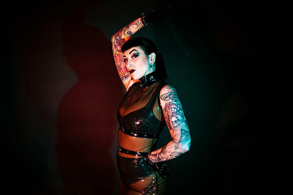 A tattooed dominatrix dressed in a sleek black latex outfit showcasing her unique style and personality