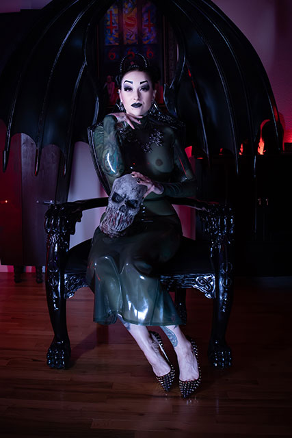 A woman in a satanic throne resting her elbow on a demon head embodying a powerful and dark presence