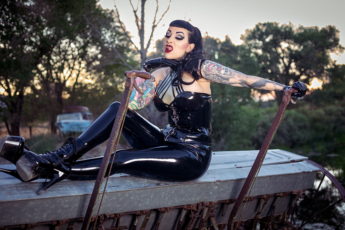 A dominatrix dressed in latex resting atop dilapidated farm machinery in an outdoor environment